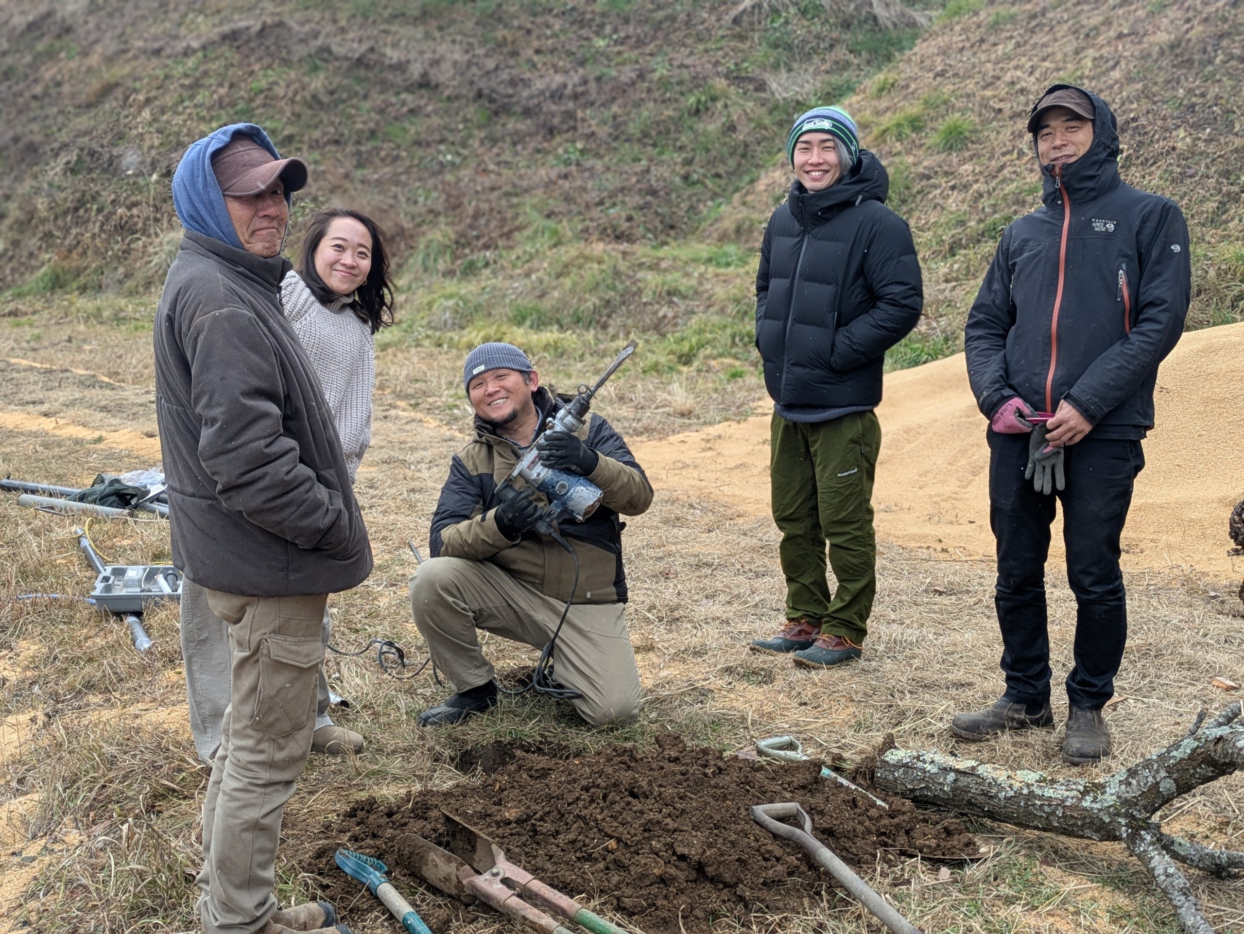 はだしの歩道、最後に足洗い場を整えます。和とろんの敷地内は残念ながら地域を流れる用水路や清流武石川にアクセスできないため、浅井戸を掘ることになりました。担当してくれたのは、和とろんの看板やはだしの歩道の休憩所を作ってくれている鉄と木の工房チームです。初日は和とろんのロゴやホームページをデザインしてくれた友人も知人と一緒にかけつけてくれました。