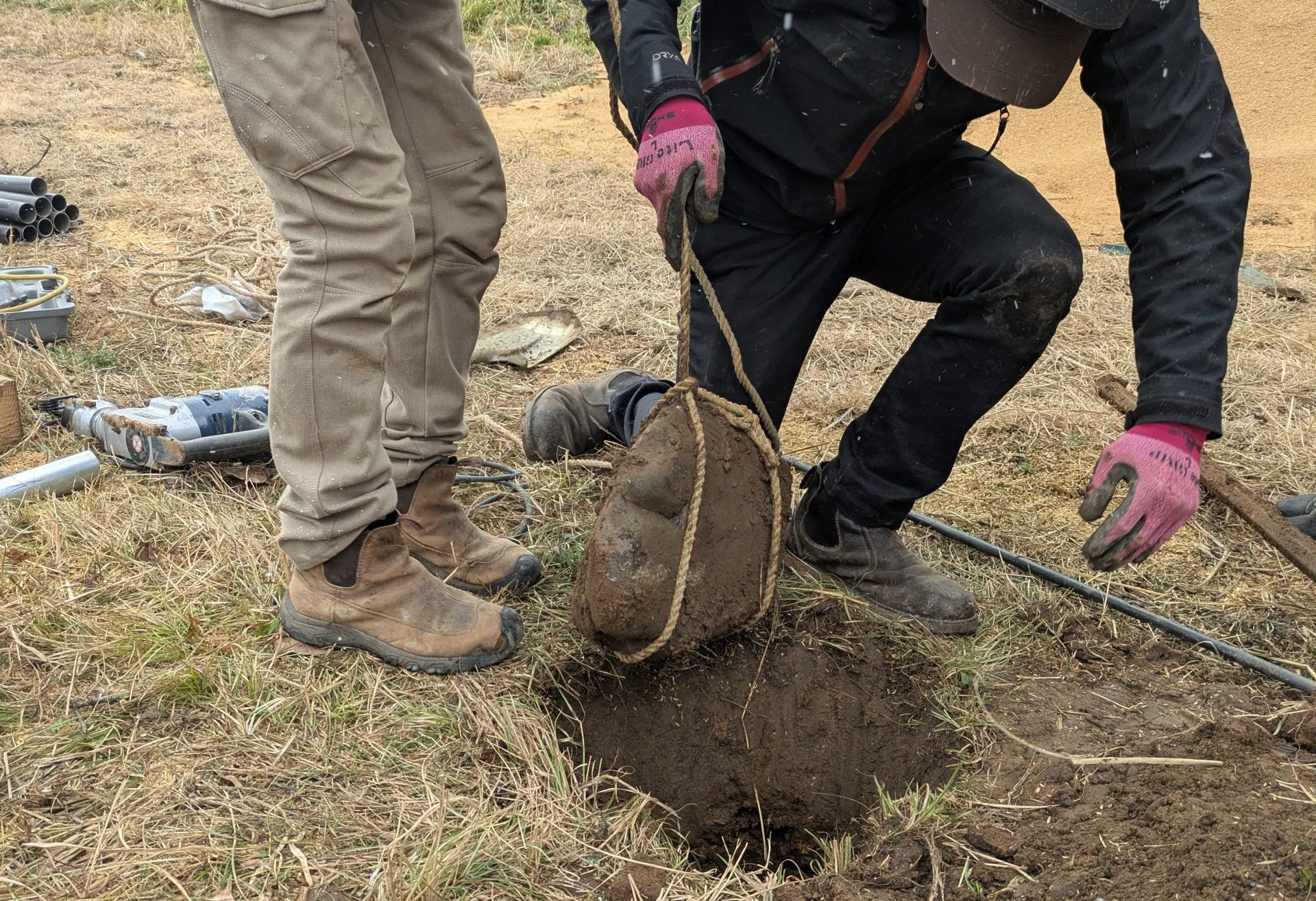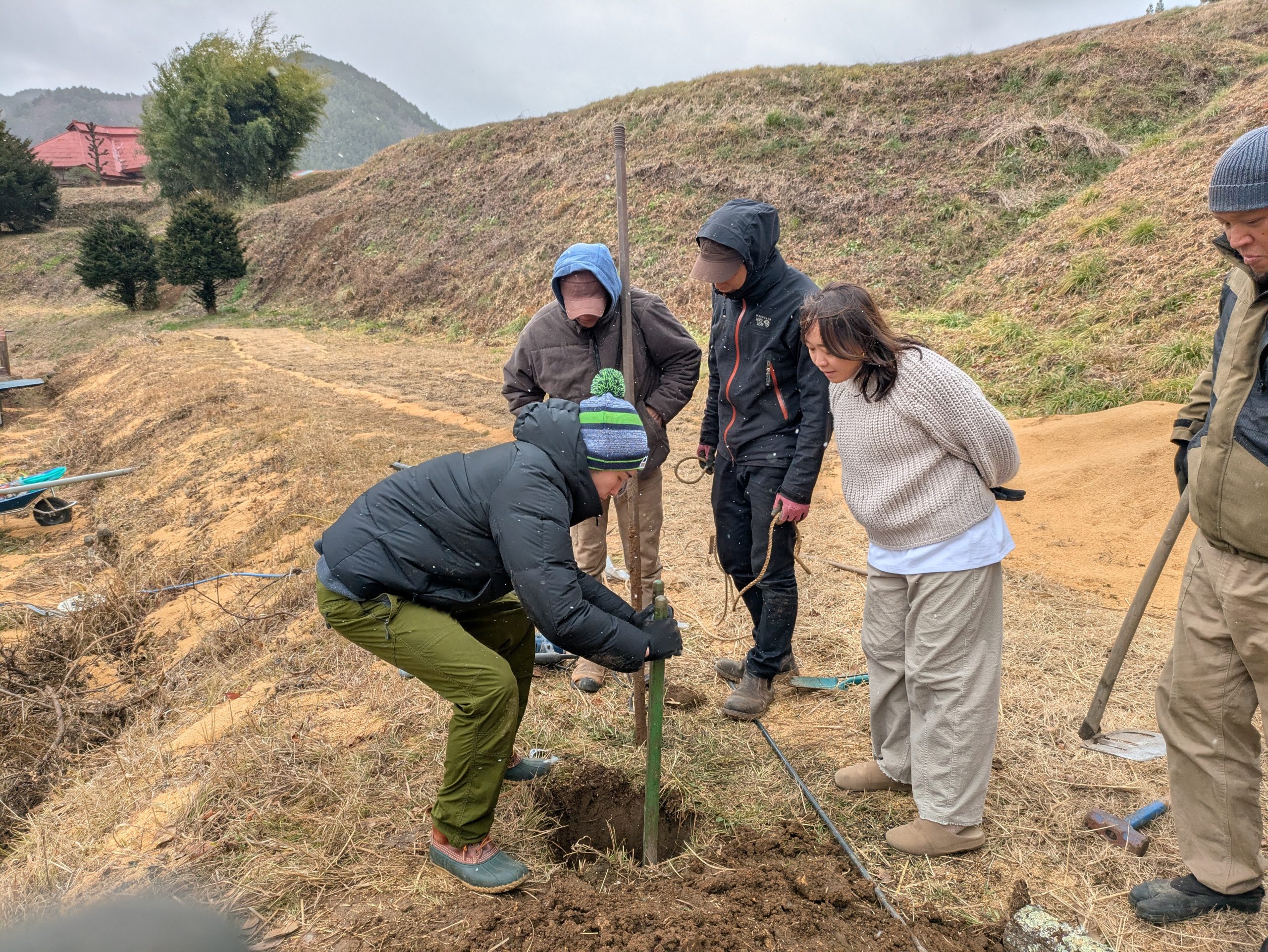 ただここは武石。地名の通り石が多く、ハンマーで打ってもなかなか杭が入りません。杭が止まれば、原因の石を探し、周りを掘って取り出します。途方もない力仕事。手でつかみようのない丸っこい大きな石は、ひょいとロープをひっかけて持ち上げますが、そのロープワークはこれから和とろんとしてもぜひ覚えたい技でした✨