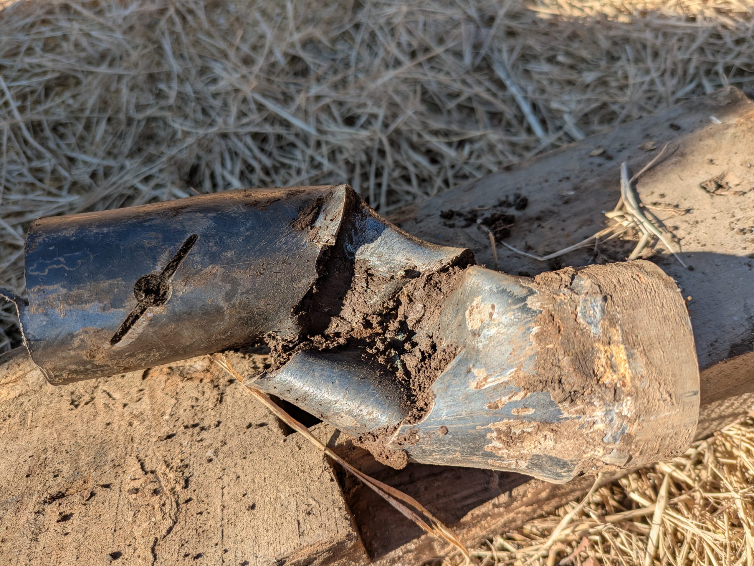 今度こそはと祈りながら作業を繰り返すこと延々。。。とうとう杭が割れてしまい、全部いったん引き抜くことになりました。すると、なんと!地中に埋まっていた杭が、中でグニャリ‼ 強い金属パイプが縄のように曲がるなんてすごい力!これでは打込めないはずでした(笑)ここは鉄工Kira Craft&Worksお得意の溶接で、曲がった部分を切り取って杭先を見事つなぎ直し、作業を再開することができました。