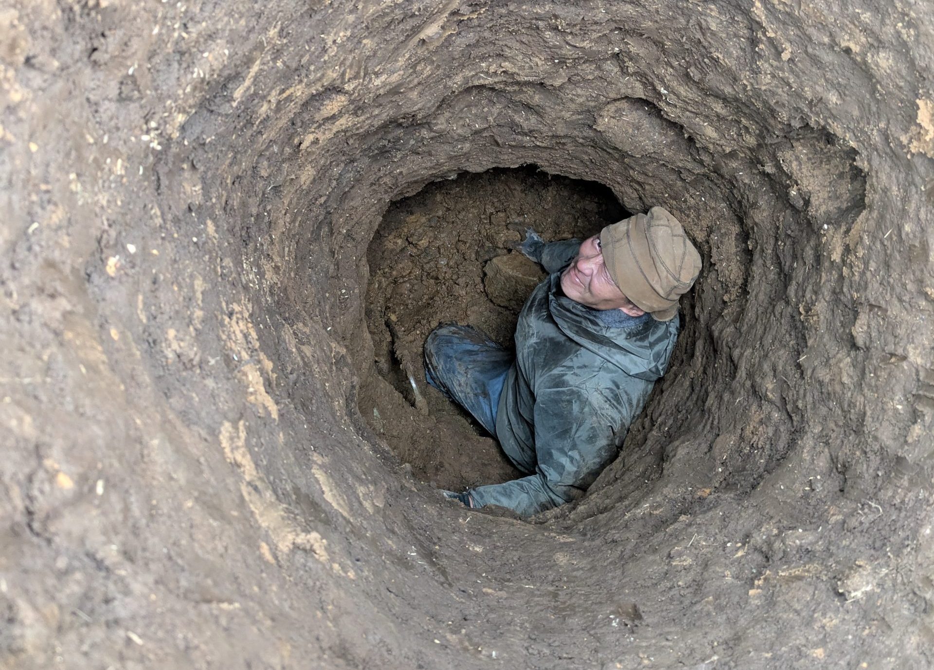 やっと岩盤を抜けると、だんだん粘土が湿り気を帯びてきて、、、水分を含んだ土がさらに重い!水が近い期待感で掘り進めると、次はコロコロした川石の層になりました。粘土の湿り気も、だいぶ水を含んでいます。時間をおいて掘った井戸をのぞいてみると、なんと水が湧いていました!