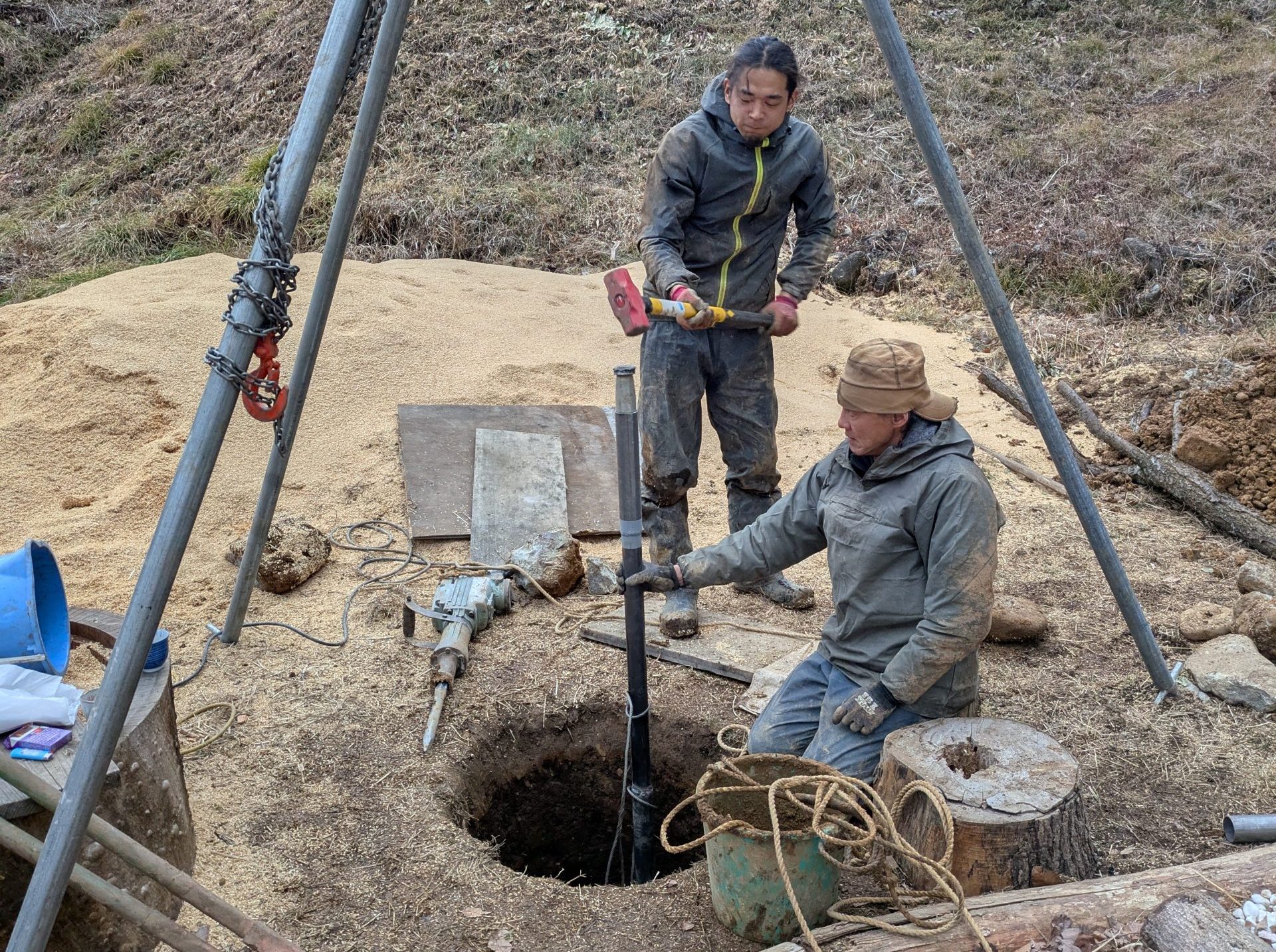 翌朝、別の場所には石がほとんどないことがわかり、掘る場所を変えることになりました。前日掘った穴は埋め戻し、新しく掘り進めていきましたが、2m位まではとても順調だったものの、山岳部では、カタイ岩盤層が多いらしく、また杭が入らなくなってしまいました。。。さてどうするか。結局、岩盤を機械で砕いて掘り進める必要があるため、打ち込み井戸から、昔ながらの堀り井戸に方向転換することになりました。