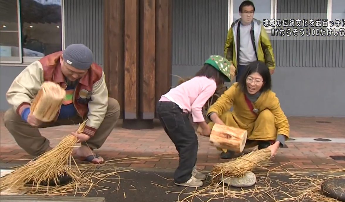 開始前の準備で、わらを柔らかくする作業を会場の外で行いました。わらの繊維を柔らかくして、扱いやすくします。木づちは講師の坂口信茂さんの手作り。道具も自分でつくってしまうなんて、すごいですね!かつては各家庭の土間にあった「じゅうべい石」と呼ばれる丸い石を台にしてたたきました。信茂さんも、まだぞうりを作れない小さい時からよくお手伝いを任されていたそうです。